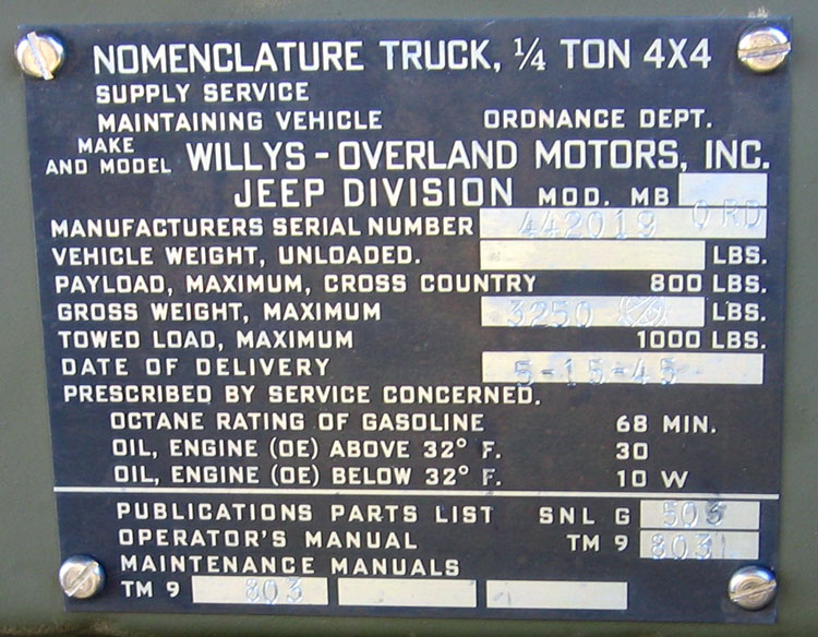Here is a photo of my 1945 Willys MB's center dataplate made by Robert deRuyter in the Netherlands. He used the original dataplates, and stamped these identically to those. Great job, dontcha think? 1