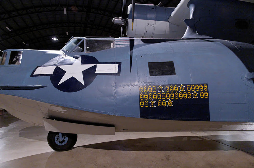 On the left side of the aircraft the crews painted rafts for a mission flown, and a star on the raft with a number for how many airmen were rescued on the mission. [See right side] (Photo by Matt R. Kyle) |